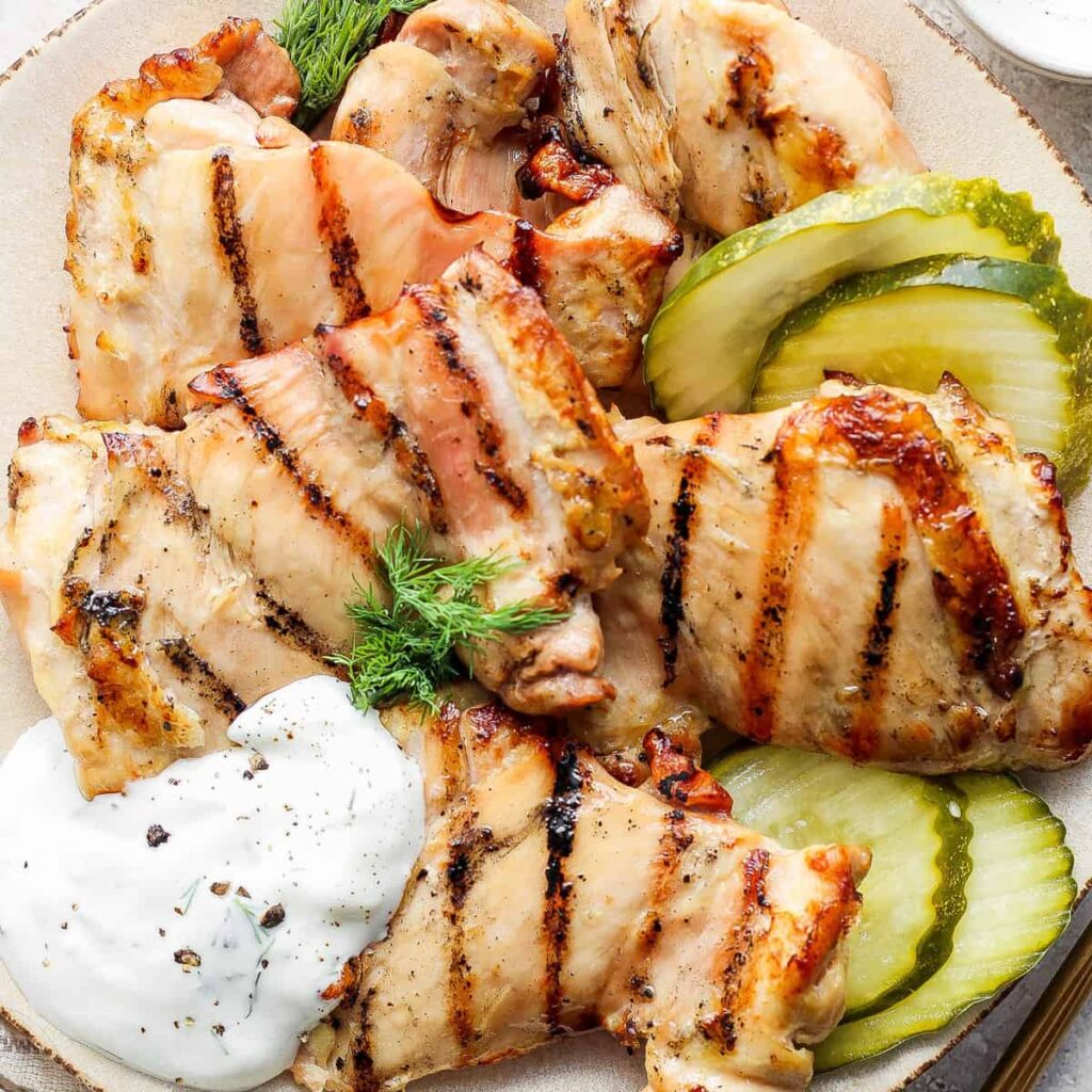 The chicken thighs soak in pickle brine and grill to juicy perfection. A vibrant and creamy dill sauce is served on top for an extra burst of flavor.